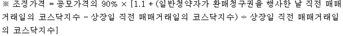 단, 일반 청약자가 환매청구권을 행사한 날 직전 매매거래일의 코스닥지수가 상장일 직전 거래일의 코스닥지수보다 10% 이상 하락했을 경우에는 조정 가격이 적용됩니다.