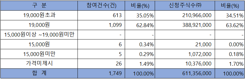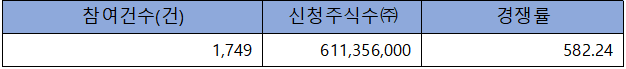 수요예측 참여 건수는 총 1,749건에 신청 주식수 611,356,000주로, 참여 경쟁률 582.24 : 1의 실적을 기록했습니다.