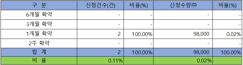 의무 보유 확약 건수는 2건에 98,000주로 전체 신청 물량 대비 건수로는 0.11%, 수량으로는 0.02 %였으나 수량이 적어 의미가 없는 수치입니다.
