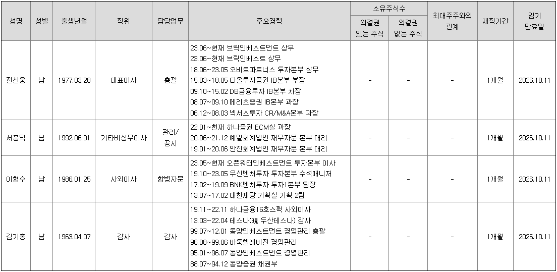 동사는 브릭스인베스트먼트의 전신웅상무가 대표이사를 맡고 있으며, 투자 업계 전문가들로 경영진을 구성하고 있습니다.