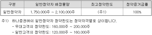 하나증권의 일반청약자 배정은 1,750,000주 ~ 2,100,000주이고, 일반 청약자의 최고 청약 한도는 일반 고객 기준 120,000주 ~ 160,000주입니다.