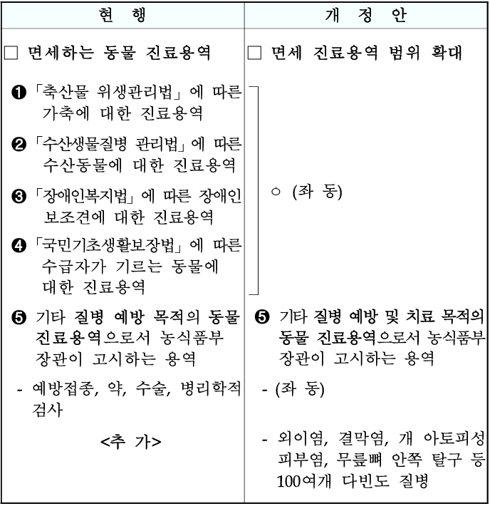 <면세하는 동물 진료 용역 개정전후 비교표>
