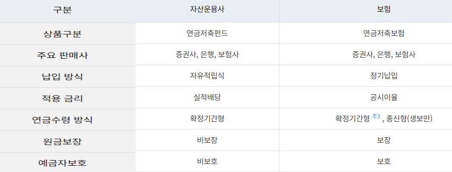 개인연금저축은 크게 연금저축보험과 연금저축펀드로 나누어지는데, 아래 표와 같은 특징을 가지고 있습니다.