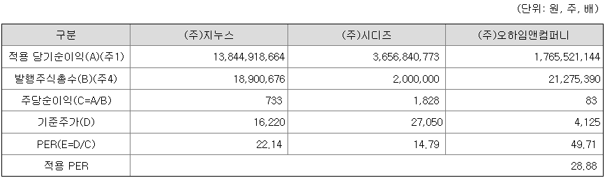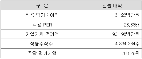 회사의 주당 평가가액은 2023년 3분기까지 누적 순이익을 연간으로 환산 한 후 유사회사의 평균 PER배수를 곱하여 회사가치를 정하고, 이를 주식 수로 나누어 신출한 것입니다.