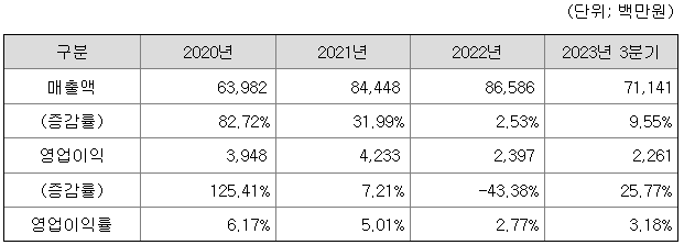 스튜디오삼익의 영업이익률은 2022년 글로벌 경기 침체기에 매출 정체와 함께 원자재 가격의 상승으로 감소하였으나 2023년 들어 회복 추세를 보이고 있습니다.