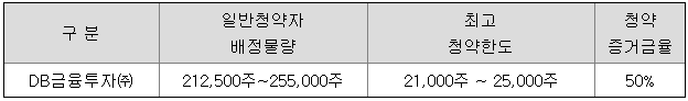 DB금융투자의 일반 청약자 배정 물량은 212,500주 ~ 225,000주이고, 일반 청약자의 최고 청약 한도는 모든 고객 공통으로 21,000주 ~ 25,000주입니다.