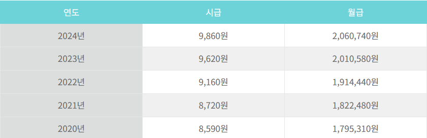 이를 소정 근로시간 40시간과 유급 주휴 수당 8시간을 포함하는 월급 기준으로 환산하면, 2023년의 2,010,580원에서 2024년에는 2,060,740원으로 증가했음을 의미합니다.