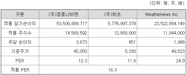 회사의 주당 평가가액은 2025년의 추정 순이익을 할인하여 현재가치로 환산환 후, 주식 수로 나누어 주당 순이익을 구한 다음, 유사회사의 평균 PER배수를 곱하여 산출한 것입니다.