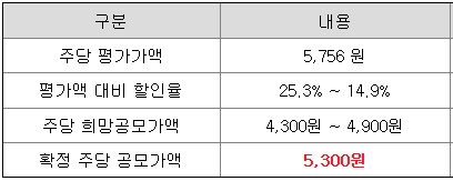당초 희망 공모가격 상단 4,900원 대비 400원(8.16%) 상향 조정된 가격입니다.