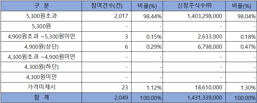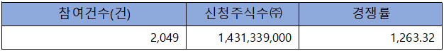수요예측 참여 건수는 총 2,049건에 신청 주식수 1,431,339,000주로, 참여 경쟁률 1,263.32 : 1의 실적을 기록했습니다.