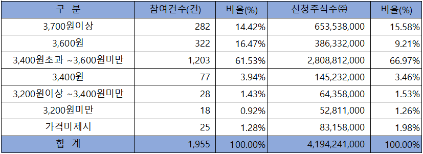 수요예측 참여 건수는 총 1,955건에 신청 주식수 4,194,241,000주로, 참여 경쟁률 838.81 : 1의 실적을 기록했습니다.