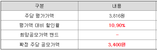 당초 희망 공모가격 상단 2,800원 대비 600원(21.43%) 상향 조정된 가격입니다.