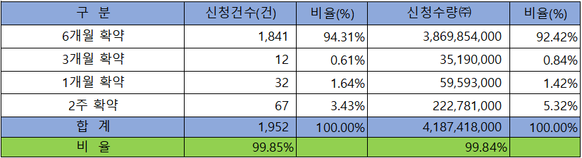 의무 보유 확약 건수는 1,952 건에 4,187,418,000주로 전체 신청 물량 대비 건수로는 99.85%, 수량으로는 99.84%의 기록적인 내용을 보이고 있습니다.
