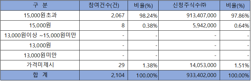 수요예측 참여 건수는 총 2,104건에 신청 주식수 933,402,000주로, 참여 경쟁률 839.03 : 1의 실적을 기록했습니다.