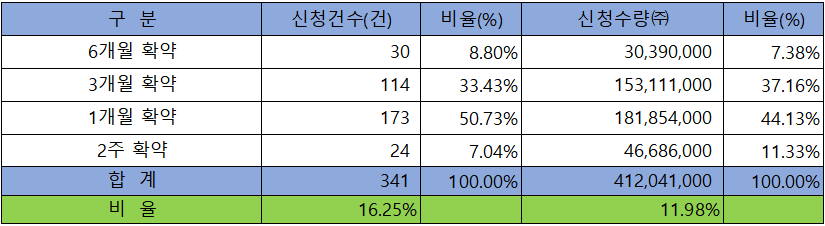 의무 보유 확약 건수는 341건에 412,041,000주로 전체 신청 물량 대비 건수로는 16.25%, 수량으로는 11.98%였으며, 1개월 확약 비중이 제일 높았습니다.