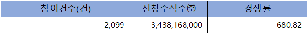 수요예측 참여 건수는 총 2,099건에 신청 주식수 3,438,168,000주로, 참여 경쟁률 680.82 : 1의 실적을 기록했습니다.