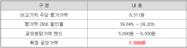 당초 희망 공모가격 상단 6,300원 대비 1,000원 (15.87%) 상향 조정된 가격입니다.
