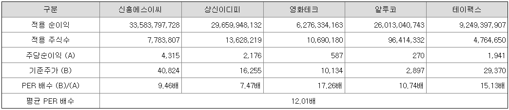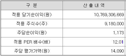 회사의 주당 평가가액은 2023년 3분기까지 순이익을 연간으로 환산한 후 주식 수로 나누어 주당 순이익을 구하고, 여기에 유사회사의 평균 PER배수를 곱하여 산출된 것입니다