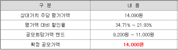당초 희망 공모가격 상단 11,000원 대비 3,000원(27.27%) 상향 조정된 가격입니다.