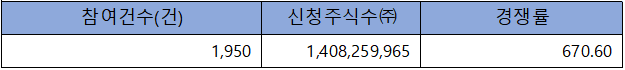 수요예측 참여 건수는 총 1,950건에 신청 주식수 1,408,259,965주로, 참여 경쟁률 670.60 : 1의 실적을 기록했습니다.