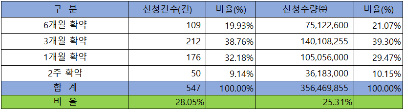 의무 보유 확약 건수는 547건에 356,469,855주로 전체 신청 물량 대비 건수로는 28.05%, 수량으로는 25.31%였으며,  3개월 확약 비중이 제일 높았습니다.
