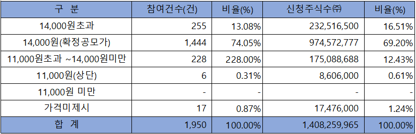희망 공모가격 상단 이상 신청 비율은 98.76%였으며, 확정 공모가 14,000원 이상 신청 비율도 85.71%에 달했습니다.