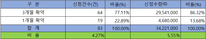 의무 보유 확약 건수는 83건에 34,221,000주로 전체 신청 물량 대비 건수로는 4.27%, 수량으로는 5.55%였으며, 3개월 확약 비중이 제일 높았습니다.
