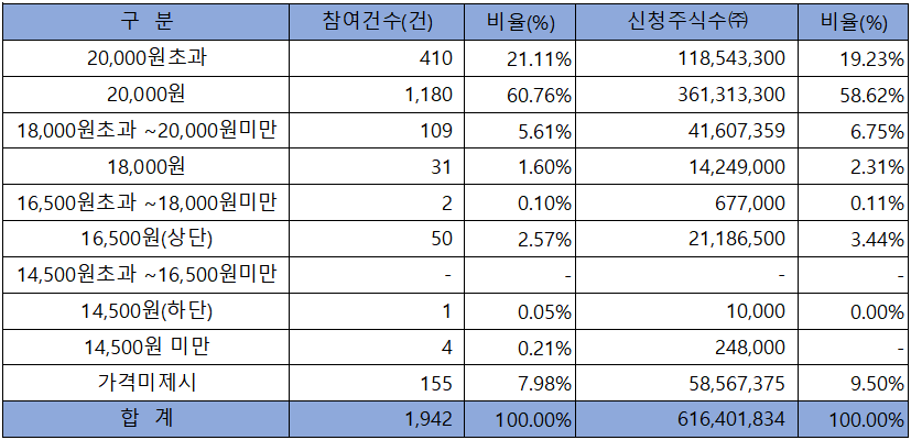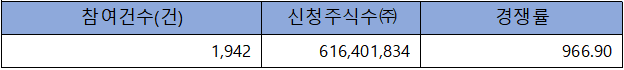 수요예측 참여 건수는 총 1942건에 신청 주식수 616,401,834주로, 참여 경쟁률 966.90 : 1의 실적을 기록했습니다.