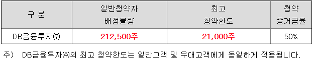 DB금융투자의 일반 청약자 배정 물량은 212,500주이고, 일반 청약자의 최고 청약 한도는 모든 고객 공통으로 21,000 주입니다.