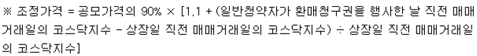 단, 환매청구권 행사일 직전영업일의 코스닥 지수가 상장 전일 코스닥 지수 대비 10% 이상 하락한 경우 행사가격은 조정 가격으로 적용됩니다.