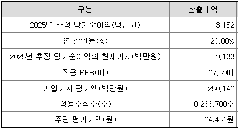 회사의 주당 평가가액은 2025년 추정 순이익을 할인하여 현재가치로 환산한 후, 유사회사의 평균 PER배수를 곱하여 회사가치를 정하고, 이를 주식수로 나누어 산출한 것입니다.