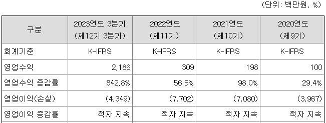 이에이트의 매출액은 2020년 1억에서 점증하다가 2023년 3분기말 현재 누적 22억의 매출 실적을 기록하고 있습니다.
