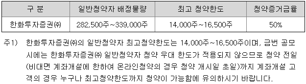 한화투자증권의 일반 청약자 배정 물량은 282,500주 ~ 339,000주이고, 일반 청약자의 최고 청약 한도는 모든 고객 공통으로 14,000주  ~  16,500주입니다.