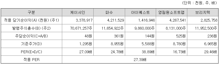 회사의 주당 평가가액은 2025년 추정 순이익을 할인하여 현재가치로 환산한 후, 유사회사의 평균 PER배수를 곱하여 회사가치를 정하고, 이를 주식수로 나누어 산출한 것입니다.