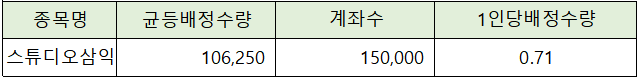 스튜디오삼익은 총 150,000 계좌가 청약에 참가해 균등 배정 수량 주를 감안하면 1인당 71%의 확률로 1주가 배정될 것으로 전망되고 있습니다.
