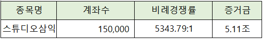 스튜디오삼익의 청약에는 5.11조의 증거금이 모이면서 비례경쟁률 5343.79 : 1의 높은 경쟁률을 나타냈습니다.