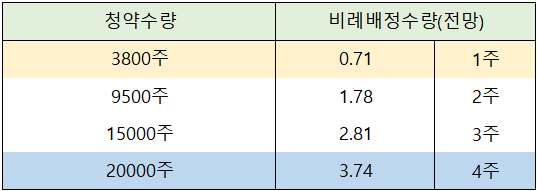 그다음 9,500주를 청약 신청한 경우 2주를 받을 수 있고, 15,000주를 신청한 경우 3주를 배정받을 수 있을 것으로 전망되고 있습니다.