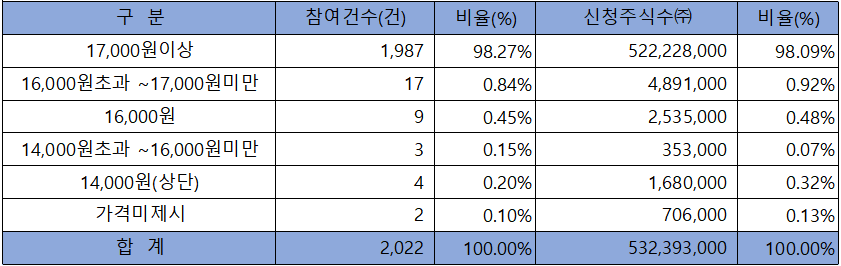 희망가격 상단 이상 비율은 99.87&였으며, 확정 공모가 16,000원 이상 신청 비율도 99.49%에 달했습니다.