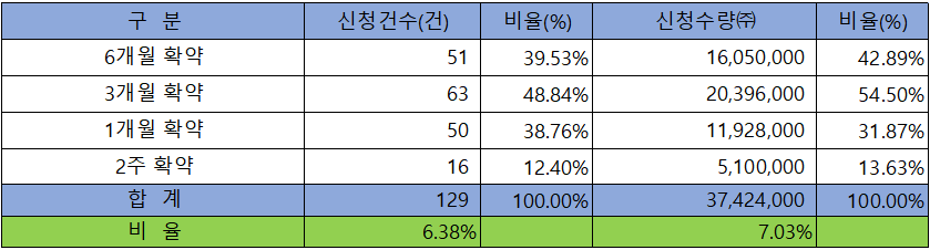 의무 보유 확약 건수는 129건에 37,424,000주로 전체 신청 물량 대비 건수로는 6.38%, 수량으로는 7.03%였으며, 3개월 확약과 6개월 확약 비중이 높아 내용이 있는 신청 결과라 하겠습니다.