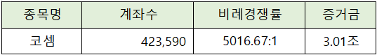 코셈의 청약에는 3.01조원의 증거금이 모이면서 비례경쟁률 5016.67 : 1의 비교적 높은 경쟁률을 나타냈습니다.