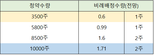 10000주까지 청약 신청한 경우에는 1.71주 배정이 예상되어 2주 배정이 될 가능성이 높게 전망되고 있습니다.