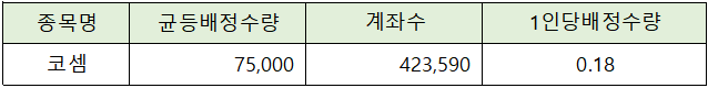 코셈은 총 423,590 계좌가 청약에 참가해 균등 배정 수량 75000주를 감안하면 1인당 0.18주가 배정될 것으로 전망되어, 균등으로 1주 배정받기가 몹시 힘들 것으로 예상됩니다.
