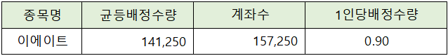 이에이트는 총 157,250 계좌가 청약에 참가해 균등 배정 수량 141,250주를 감안하면 1인당 0.9주가 배정될 것으로 전망되어, 청약 신청하신 분들은 90%의 확률로 1주 배정이 예상되고 있습니다.