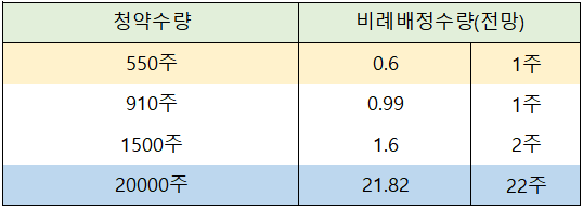 20,000주까지 청약 신청한 경우에는 22주 배정이 예상됩니다.
