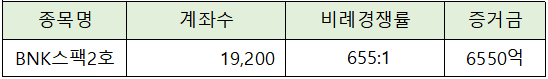 BNK 스팩 2호의 청약에는 6,550억원의 증거금이 모이면서 비례경쟁률 655 : 1의 경쟁률을 나타냈습니다.