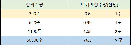 비례배정의  경우 1주 배정을 위한 커트라인은 390주로 전망되고 있습니다.