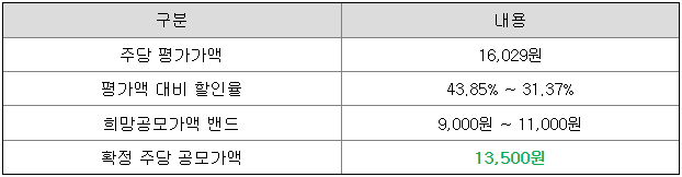당초 희망 공모가격 상단 11,000원 대비 2,500원(22.73%) 상향 조정된 가격입니다.