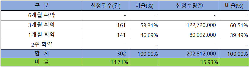의무 보유 확약 건수는 302건에 202,812,000주로 전체 신청 물량 대비 건수로는 14.71%, 수량으로는 15.93%였으며, 3개월 확약 비중이 높았습니다.
