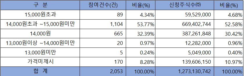 가격을 제시하지 않은 기관 투자자들을 제외하고 모든 참여자들이 희망 공모가격 보다 높은 13,000원 이상을 제시하였고, 확정공모가 13,500원보다 높은 14,000원 이상 신청 비율도 87.67%에 달했습니다.