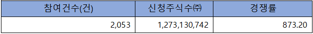 수요예측 참여 건수는 총 2,053건에 신청 주식수 1,273,130,742주로, 참여 경쟁률 873.20 : 1의 실적을 기록했습니다.